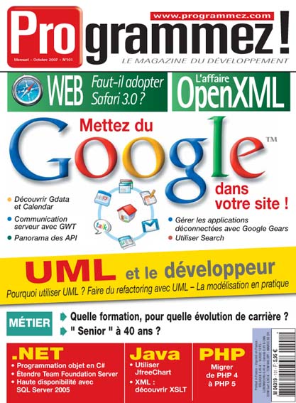 Dans programmez! PDF #101 Paru le 01/10/2007 S'ABONNER Evénements Microsoft : agenda 2008 Lire la suite de Microsoft : agenda 2008 OpenXML : le non mais de la France Lire la suite de OpenXML : le non mais de la France SGBD Haute disponibilité et hautes performances avec SQL Server 2005 Lire la suite de Haute disponibilité et hautes performances avec SQL Server 2005 Poste de travail Découvrir le bureau de… François Tonic Lire la suite de Découvrir le bureau de… François Tonic Gourou Interview de Miguel de Icaza Lire la suite de Interview de Miguel de Icaza Gros Plan Safari 3.0 : faut-il s’y mettre ? Lire la suite de Safari 3.0 : faut-il s’y mettre ? Dossier Dossier Google : le monde merveilleux des développeurs ! Lire la suite de Dossier Google : le monde merveilleux des développeurs ! Dossier UML Lire la suite de Dossier UML Technique Etendre Team Foundation Server Lire la suite de Etendre Team Foundation Server Snapshot test : efficacité et productivité dans le développement des tests unitaires Lire la suite de Snapshot test : efficacité et productivité dans le développement des tests unitaires Carrière Métiers du développement : Quelles évolutions de carrières et formations ? Lire la suite de Métiers du développement : Quelles évolutions de carrières et formations ? Senior à 40 ans ? Lire la suite de Senior à 40 ans ? Code XSLT : passer du XHTML au (presque) tout XML (1re partie) Lire la suite de XSLT : passer du XHTML au (presque) tout XML (1re partie) Migration de PHP 4 vers PHP 5 Lire la suite de Migration de PHP 4 vers PHP 5 La programmation orientée objet avec C# Lire la suite de La programmation orientée objet avec C# Utilisation du pattern command avec WPF Lire la suite de Utilisation du pattern command avec WPF Visualisez vos données avec Java et JFreeChart Oui Lire la suite de Visualisez vos données avec Java et JFreeChart