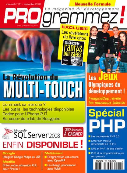 Dans programmez! PDF #111 Paru le 01/09/2008 S'ABONNER Evénements PHP 5.3 : toutes les nouveautés Lire la suite de PHP 5.3 : toutes les nouveautés Gros Plan SQL Server 2008 Lire la suite de SQL Server 2008 Dossier Multi-Touch Lire la suite de Multi-Touch Reportage ImagineCup 2008 Lire la suite de ImagineCup 2008 Bonnes feuilles Microsoft... l’après Bill Gates Lire la suite de Microsoft... l’après Bill Gates Code Un moteur de template en PHP 5 Lire la suite de Un moteur de template en PHP 5 Développer à l’aide de composants Lire la suite de Développer à l’aide de composants UML et le génie logiciel : développer avec PHiMX Lire la suite de UML et le génie logiciel : développer avec PHiMX Combiner Google Maps et composants JSF Lire la suite de Combiner Google Maps et composants JSF Flex 3 compatible Linux ? Lire la suite de Flex 3 compatible Linux ? Créer une extension Firefox avec XUL Lire la suite de Créer une extension Firefox avec XUL OpenMP et les processeurs multi-coeurs Lire la suite de OpenMP et les processeurs multi-coeurs Observez la charge de votre processeur multi-coeur sous Windows Lire la suite de Observez la charge de votre processeur multi-coeur sous Windows SQLAlchemy : faites du mapping objet/relationnel en Python Lire la suite de SQLAlchemy : faites du mapping objet/relationnel en Python