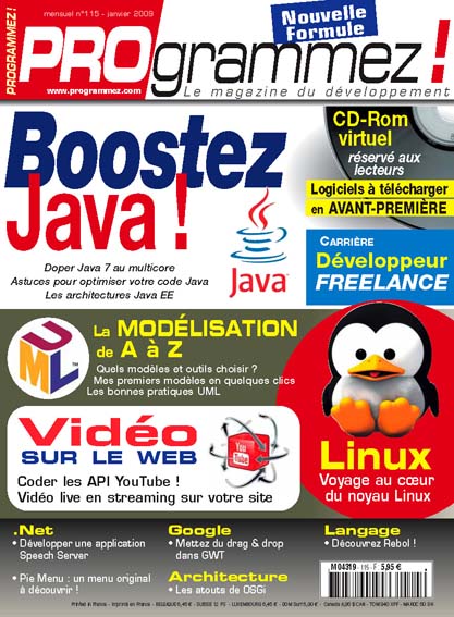 Dans programmez! PDF #115 Paru le 01/01/2009 S'ABONNER Evénements Au coeur du noyau Linux Lire la suite de Au coeur du noyau Linux Dossier Boostez java ! Lire la suite de Boostez java ! Projet La modélisation de A à Z Lire la suite de La modélisation de A à Z Développement web Dopez votre site web à la vidéo Lire la suite de Dopez votre site web à la vidéo Carrière Epitech, le réseau et la passion Lire la suite de Epitech, le réseau et la passion Travailler en freelance Lire la suite de Travailler en freelance Code Un menu original : le Pie Menu ! Oui Lire la suite de Un menu original : le Pie Menu ! Développer une application Speech Server avec le framework.net Lire la suite de Développer une application Speech Server avec le framework.net L’architecture et la technologie OSGI Lire la suite de L’architecture et la technologie OSGI Programmez OpenGL avec le langage Ruby (2e partie) Oui Lire la suite de Programmez OpenGL avec le langage Ruby (2e partie) A la découverte de Rebol Oui Lire la suite de A la découverte de Rebol Réaliser un composant " glisser-déposer " avec GWT Lire la suite de Réaliser un composant " glisser-déposer " avec GWT