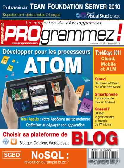 Dans programmez! PDF #138 Paru le 01/02/2011 S'ABONNER Cahier détachable Tout savoir sur Team Foundation Server 2010 Lire la suite de Tout savoir sur Team Foundation Server 2010 Evénement TechDays 2011 : du Cloud, du Mobile, de l’ALM Lire la suite de TechDays 2011 : du Cloud, du Mobile, de l’ALM VisualStudio 2010 Service Pack 1 : quoi de neuf ? Lire la suite de VisualStudio 2010 Service Pack 1 : quoi de neuf ? matériel Test du Nas MyDitto Lire la suite de Test du Nas MyDitto webmaster Choisir sa plateforme de blog ! Lire la suite de Choisir sa plateforme de blog ! SGBD Les bases NoSQL vont-elles tuer les bases relationnelles ? Lire la suite de Les bases NoSQL vont-elles tuer les bases relationnelles ? Dossier Atom, AppUp : une nouvelle plateforme pour le développeur ! Lire la suite de Atom, AppUp : une nouvelle plateforme pour le développeur ! carrière Enquête : l’informatique booste la carrière des femmes Lire la suite de Enquête : l’informatique booste la carrière des femmes Code Créer votre première application ASP.NET MVC 3 sur Windows Azure Oui Lire la suite de Créer votre première application ASP.NET MVC 3 sur Windows Azure Combiner Flex et Android c’est possible ! Oui Lire la suite de Combiner Flex et Android c’est possible ! CKlone : l’IDE du Cloud ! Lire la suite de CKlone : l’IDE du Cloud ! Ajuster la fréquence de votre processeur avec l'API Windows Power Management Oui Lire la suite de Ajuster la fréquence de votre processeur avec l'API Windows Power Management Ecrire des extensions pour les navigateurs Opera et Safari Oui Lire la suite de Ecrire des extensions pour les navigateurs Opera et Safari