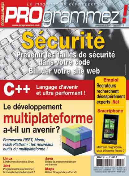 Dans programmez! PDF #140 Paru le 01/04/2011 S'ABONNER SGBD Réplication de fusion avec SQL Server Compact Lire la suite de Réplication de fusion avec SQL Server Compact Webmaster Comment sécuriser son site web ? Lire la suite de Comment sécuriser son site web ? Gros plan C++ plus que jamais d’actualité Lire la suite de C++ plus que jamais d’actualité Dossier Le multiplateforme : nouvelle génération ou illusion ? Lire la suite de Le multiplateforme : nouvelle génération ou illusion ? Carrière Retour sur les TechDays 2011 : les recrutements repartent très fort ! Lire la suite de Retour sur les TechDays 2011 : les recrutements repartent très fort ! Code Analyse de l’ergonomie sur Windows Phone 7 Lire la suite de Analyse de l’ergonomie sur Windows Phone 7 IIS Express : le nouveau serveur web pour le développeur Lire la suite de IIS Express : le nouveau serveur web pour le développeur S’inspirer d’Atom et de Google pour créer des services Web Restful Lire la suite de S’inspirer d’Atom et de Google pour créer des services Web Restful Créer une carte avec des marqueurs, grâce à Google Maps API version 2 et 3 et Dojo Toolkit Lire la suite de Créer une carte avec des marqueurs, grâce à Google Maps API version 2 et 3 et Dojo Toolkit Introduction à la programmation par contraintes en Java Lire la suite de Introduction à la programmation par contraintes en Java Instrumentalisez vos Linux Lire la suite de Instrumentalisez vos Linux Async : une nouvelle approche de la programmation Asynchrone sous .NET Lire la suite de Async : une nouvelle approche de la programmation Asynchrone sous .NET