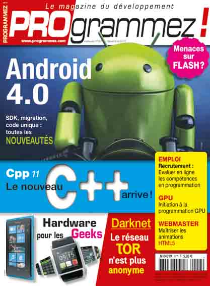 Dans programmez! PDF #147 Paru le 01/12/2011 S'ABONNER buzzword Adobe flashe le mobile et Flex Lire la suite de Adobe flashe le mobile et Flex sécurité TOR perd son anonymat, le Darknet tangue Lire la suite de TOR perd son anonymat, le Darknet tangue veille techno Cpp11, une évolution majeure du langage C++ Oui Lire la suite de Cpp11, une évolution majeure du langage C++ dossier Android 4.0 disponible ! Lire la suite de Android 4.0 disponible ! Carriere Evaluer en ligne les compétences de programmation des candidats Lire la suite de Evaluer en ligne les compétences de programmation des candidats Soutenir les TPE PME de l’informatique Lire la suite de Soutenir les TPE PME de l’informatique technique Concevoir des applications aujourd’hui : quels changements ? Comment s’adapter ? Lire la suite de Concevoir des applications aujourd’hui : quels changements ? Comment s’adapter ? outils Installer GIT en un clin d'oeil en mode SaaS sur le Cloud Lire la suite de Installer GIT en un clin d'oeil en mode SaaS sur le Cloud gaming A la découverte du SDK de l’AR. Drone (2e partie) Lire la suite de A la découverte du SDK de l’AR. Drone (2e partie) code Design By Contract : Code Contracts avec C# 4.0 Lire la suite de Design By Contract : Code Contracts avec C# 4.0 Introduction à la programmation GPU (1re partie) Lire la suite de Introduction à la programmation GPU (1re partie) FLEX Mobile : Flex sait aussi se faire mobile Oui Lire la suite de FLEX Mobile : Flex sait aussi se faire mobile Devenir un développeur iOS (4e partie) Lire la suite de Devenir un développeur iOS (4e partie) Git : boostez votre gestion de configuration Lire la suite de Git : boostez votre gestion de configuration webmaster L'animation web en HTML5 et en 2D Oui Lire la suite de L'animation web en HTML5 et en 2D