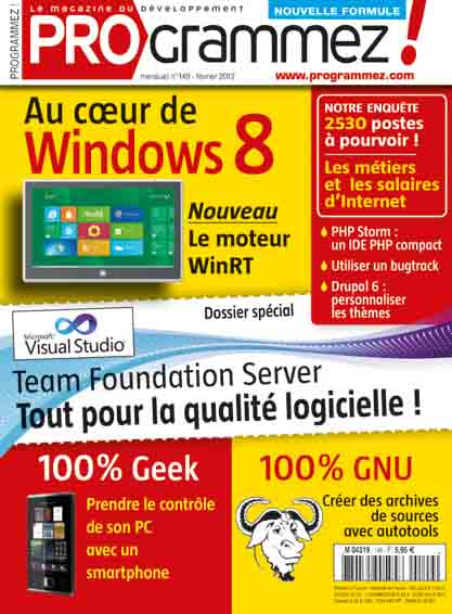 Dans programmez! PDF #149 Paru le 01/02/2012 S'ABONNER Buzzword Mise à jour automatique : le débat relancé Lire la suite de Mise à jour automatique : le débat relancé Outils Utiliser un bug tracker Lire la suite de Utiliser un bug tracker Matériel Le futur de l’électronique et de l’informatique Lire la suite de Le futur de l’électronique et de l’informatique Sécurité Sécuriser votre mot de passe Lire la suite de Sécuriser votre mot de passe veille techno AU COEUR DE WINDOWS 8 : WINRT Lire la suite de AU COEUR DE WINDOWS 8 : WINRT LE DÉVELOPPEUR DU MOIS De la chimie à l’open source Lire la suite de De la chimie à l’open source Carrière Les métiers de l'internet : une profonde évolution des profils et des compétences Lire la suite de Les métiers de l'internet : une profonde évolution des profils et des compétences Tendances de l’emploi informatique Lire la suite de Tendances de l’emploi informatique Atos : 1000 recrutements en 2012 Lire la suite de Atos : 1000 recrutements en 2012 Je débute... Introduction à l’architecture CUDA (3e partie) Lire la suite de Introduction à l’architecture CUDA (3e partie) PhpStorm : accélérer les développements PHP Lire la suite de PhpStorm : accélérer les développements PHP Bien débuter avec Visual C++ Lire la suite de Bien débuter avec Visual C++ Supplément Team Foundation Server : Tout pour la qualité logicielle Lire la suite de Team Foundation Server : Tout pour la qualité logicielle Pratique TestNG : le framework de tests nouvelle génération ! Lire la suite de TestNG : le framework de tests nouvelle génération ! Prenez le contrôle de votre ordinateur à partir de votre Smartphone Lire la suite de Prenez le contrôle de votre ordinateur à partir de votre Smartphone Cas d'usage Personnaliser un thème sous Drupal 6 Lire la suite de Personnaliser un thème sous Drupal 6 Construire une distribution de sources GNU Lire la suite de Construire une distribution de sources GNU Gaming Concevoir un design d'interaction sur Surface 2.0 Lire la suite de Concevoir un design d'interaction sur Surface 2.0 Webmaster Comment traquer (efficacement) les bugs de son site Web ? Lire la suite de Comment traquer (efficacement) les bugs de son site Web ? Bugtrack Repérer une valeur NULL Lire la suite de Repérer une valeur NULL