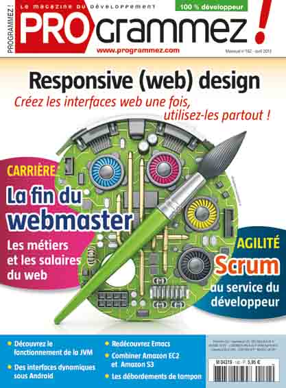 Dans programmez! PDF #162 Paru le 01/04/2013 S'ABONNER Développeur du mois Ayez toujours faim de technologie ! Lire la suite de Ayez toujours faim de technologie ! Outils Faut-il passer à Zend Framework 2 ? Lire la suite de Faut-il passer à Zend Framework 2 ? Veille techno Responsive Design : une autre manière de penser le développement Lire la suite de Responsive Design : une autre manière de penser le développement Responsive Web Design : définitions et approches Lire la suite de Responsive Web Design : définitions et approches Passer au « responsive web design » Lire la suite de Passer au « responsive web design » Votre site « responsive » Lire la suite de Votre site « responsive » Réaliser son premier site adaptatif avec l’approche mobile-first Oui Lire la suite de Réaliser son premier site adaptatif avec l’approche mobile-first Dossier Scrum L’agilité et Scrum dans la vie du développeur Lire la suite de L’agilité et Scrum dans la vie du développeur Utiliser (concrètement) Scrum Lire la suite de Utiliser (concrètement) Scrum Du Slow Scrum à l’hyperproductivité : le rôle et les outils du ScrumMaster Lire la suite de Du Slow Scrum à l’hyperproductivité : le rôle et les outils du ScrumMaster Intégrer une équipe Scrum Lire la suite de Intégrer une équipe Scrum Le Product Owner : « Le métier au coeur de la Technique ! » Lire la suite de Le Product Owner : « Le métier au coeur de la Technique ! » ScrumMaster : devenir un expert Scrum Lire la suite de ScrumMaster : devenir un expert Scrum Carrière La fin du webmaster Vive les métiers du web ! Lire la suite de La fin du webmaster Vive les métiers du web ! Je débute avec... Utilisons Emacs Lire la suite de Utilisons Emacs Démystifier le développement des plug-ins d’Eclipse Lire la suite de Démystifier le développement des plug-ins d’Eclipse Comprendre le fonctionnement de la machine virtuelle Java Oui Lire la suite de Comprendre le fonctionnement de la machine virtuelle Java Comment combiner Amazon EC2 et S3 pour un service web ? Lire la suite de Comment combiner Amazon EC2 et S3 pour un service web ? Cas d’usage Construire des IHM dynamiques sur Android avec les Fragments Lire la suite de Construire des IHM dynamiques sur Android avec les Fragments Pratique Marmalade Quick : Développement rapide de jeux 2D multiplateformes Lire la suite de Marmalade Quick : Développement rapide de jeux 2D multiplateformes Débordement de tampon : comprendre le mécanisme et s’en prémunir Oui Lire la suite de Débordement de tampon : comprendre le mécanisme et s’en prémunir Bugtrack IntelliJ IDEA 12 : bug d’applications Web Lire la suite de IntelliJ IDEA 12 : bug d’applications Web