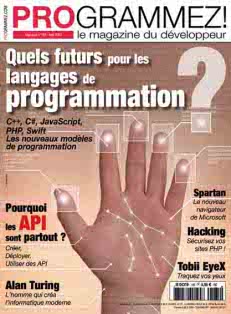 Dans programmez! PDF #185 Paru le 28/04/2015 S'ABONNER Edito « C’est la faute à Turing » Lire la suite de « C’est la faute à Turing » Web Spartan : le nouveau navigateur Lire la suite de Spartan : le nouveau navigateur Silicon Valley (Les) héritiers d’Alan Turing ! Lire la suite de (Les) héritiers d’Alan Turing ! Hacking Comment sécuriser vos applications Web avec MkFramework ? Lire la suite de Comment sécuriser vos applications Web avec MkFramework ? Carrière Développeur « Le plus beau métier du monde.» Lire la suite de Développeur « Le plus beau métier du monde.» Développeur du mois Interview de François Zaninotto, CEO de Marmelab Lire la suite de Interview de François Zaninotto, CEO de Marmelab Dmitry Gritskevich, développeur Java chez Oodrive Lire la suite de Dmitry Gritskevich, développeur Java chez Oodrive Je débute avec Bienvenue dans l’économie des API Lire la suite de Bienvenue dans l’économie des API Développer facilement vos APIs Web avec APISpark Lire la suite de Développer facilement vos APIs Web avec APISpark Langages de description des APIs Web Lire la suite de Langages de description des APIs Web Coder sa première API avec python 1ère partie 1 Lire la suite de Coder sa première API avec python 1ère partie Swagger : un langage de description d’API Lire la suite de Swagger : un langage de description d’API Futur Quels futurs pour les langages de programmation ? Lire la suite de Quels futurs pour les langages de programmation ? C++ 11 et la révolution du « modern C++ » Lire la suite de C++ 11 et la révolution du « modern C++ » Java : plateforme du passé, du présent et encore du futur ? Lire la suite de Java : plateforme du passé, du présent et encore du futur ? Méta-programmation et AOP selon Aspectize Lire la suite de Méta-programmation et AOP selon Aspectize TypeScript : le langage en pleine ascension Lire la suite de TypeScript : le langage en pleine ascension L’avenir de C# 7 : la communauté participe et décide avec Microsoft Lire la suite de L’avenir de C# 7 : la communauté participe et décide avec Microsoft En route vers PHP 7 Lire la suite de En route vers PHP 7 Programmation par Contrats : sûreté, sécurité, fiabilité Lire la suite de Programmation par Contrats : sûreté, sécurité, fiabilité Pourquoi créer un nouveau langage ? Lire la suite de Pourquoi créer un nouveau langage ? SWIFT : un langage en évolution constante depuis 12 mois ! Lire la suite de SWIFT : un langage en évolution constante depuis 12 mois ! Bluetooth Le Bluetooth Low Energy dans les applications universelles 1ère partie Lire la suite de Le Bluetooth Low Energy dans les applications universelles 1ère partie Coding4fun Faites de la musique avec le plugin VST 1 Lire la suite de Faites de la musique avec le plugin VST Big Brother is Watching You… ou l’inverse 1 Lire la suite de Big Brother is Watching You… ou l’inverse Wearable Les wearables à l’heure des montres connectées 1 Lire la suite de Les wearables à l’heure des montres connectées SharePoint Accéder à SharePoint 2013 via l'API REST en Objective-C Lire la suite de Accéder à SharePoint 2013 via l'API REST en Objective-C JavaScript JavaScript pour les Jedi, épisode III : La revanche des prototypes 1 Lire la suite de JavaScript pour les Jedi, épisode III : La revanche des prototypes Drupal Votre boutique en ligne avec Drupal Commerce & Platform.sh 1ère partie Lire la suite de Votre boutique en ligne avec Drupal Commerce & Platform.sh 1ère partie