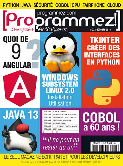 Dans programmez! PDF #233 Paru le 27/09/2019 S'ABONNER Roadmap Roadmap des langages Lire la suite de Roadmap des langages Cloud Comment Nutanix Calm facilite la mise en place des pipelines CI/CD Lire la suite de Comment Nutanix Calm facilite la mise en place des pipelines CI/CD GUI Air interface : la révolution de l’interface et de l’ergonomie Lire la suite de Air interface : la révolution de l’interface et de l’ergonomie Matériel Fairphone 3, le téléphone modulaire et réparable : réalité ou simple promesse ? Lire la suite de Fairphone 3, le téléphone modulaire et réparable : réalité ou simple promesse ? Formation Formation tout au long de la vie d’un informaticien : le mentorat Lire la suite de Formation tout au long de la vie d’un informaticien : le mentorat Cobol Cobol : toujours d’actualité ! Lire la suite de Cobol : toujours d’actualité ! Cobol : 60 ans et toujours en forme Lire la suite de Cobol : 60 ans et toujours en forme L’automatisation et les outils modernes boostent l’efficacité des développeurs mainframe Lire la suite de L’automatisation et les outils modernes boostent l’efficacité des développeurs mainframe Comment Openframe veut sortir le mainframe du monolithique ? Lire la suite de Comment Openframe veut sortir le mainframe du monolithique ? Nouveauté Quoi de neuf Angular ? Lire la suite de Quoi de neuf Angular ? Windows Subsystem for Linux 2 (WSL2) Lire la suite de Windows Subsystem for Linux 2 (WSL2) Java 13 : une version principalement technique Lire la suite de Java 13 : une version principalement technique Les nouveautés d’ASP.NET Core 3, à la découverte de gRPC Lire la suite de Les nouveautés d’ASP.NET Core 3, à la découverte de gRPC CPU La vectorisation dans les CPU modernes Lire la suite de La vectorisation dans les CPU modernes Python Réaliser un Mastermind avec Tkinter 1 Lire la suite de Réaliser un Mastermind avec Tkinter Mobile Une application mobile intelligente avec Azure Machine Learning Studio et Xamarin 1 Lire la suite de Une application mobile intelligente avec Azure Machine Learning Studio et Xamarin Java Arthas : l’outil de diagnostics d’Alibaba Lire la suite de Arthas : l’outil de diagnostics d’Alibaba Craft Man versus Legacy : Gilded Rose 1 Lire la suite de Man versus Legacy : Gilded Rose Cloud Architecture Serverless : de la Théorie à la pratique 3/3 Lire la suite de Architecture Serverless : de la Théorie à la pratique 3/3