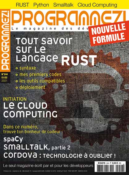 Dans programmez! PDF #244 Paru le 04/01/2021 S'ABONNER Rust Vous allez en pincer pour Rust 1 Lire la suite de Vous allez en pincer pour Rust Rust, au-delà du buzz : un langage moderne, pour tous ! Lire la suite de Rust, au-delà du buzz : un langage moderne, pour tous ! Développement cloud Démarrer dans le développement cloud 1 Lire la suite de Démarrer dans le développement cloud Multimédia Scripter VLC avec Pharo FFI Lire la suite de Scripter VLC avec Pharo FFI Technologie Cordova : pourquoi ne faut-il plus l’utiliser dans un développement mobile hybride ? Lire la suite de Cordova : pourquoi ne faut-il plus l’utiliser dans un développement mobile hybride ? Karbon Platform Services : des interfaces de données simplifiées pour les déploiements Edge et IoT Lire la suite de Karbon Platform Services : des interfaces de données simplifiées pour les déploiements Edge et IoT Roadmap Roadmap des langages Lire la suite de Roadmap des langages Smalltalk Smalltalk : le retour d’un langage mythique Lire la suite de Smalltalk : le retour d’un langage mythique Richard Uttner : un développeur Smalltalk pour toujours! Lire la suite de Richard Uttner : un développeur Smalltalk pour toujours! Visualisation des données Visualisation agile avec Roassal Lire la suite de Visualisation agile avec Roassal Applications Web Applications Web avec Seaside Lire la suite de Applications Web avec Seaside Authentification Implémenter un double facteur d’authentification par SMS Lire la suite de Implémenter un double facteur d’authentification par SMS I.A TensorFlow/Keras : accès facile au Deep Learning pour les développeurs Python 1 Lire la suite de TensorFlow/Keras : accès facile au Deep Learning pour les développeurs Python TALN - NLP Introduction au TALN (Traitement Automatique du Langage Naturel) avec spaCy 1 Lire la suite de Introduction au TALN (Traitement Automatique du Langage Naturel) avec spaCy Admininistration Gestion avancée de fichiers 1 Lire la suite de Gestion avancée de fichiers