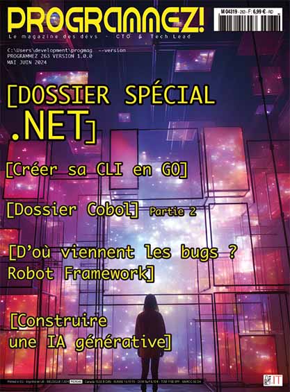 Dans programmez! PDF #263 Paru le 31/05/2024 S'ABONNER Métier Le guide du succès du développeur Lire la suite de Le guide du succès du développeur Consultant IT : quelle posture adopter pour devenir un partenaire de confiance ? Lire la suite de Consultant IT : quelle posture adopter pour devenir un partenaire de confiance ? .NET Les nouveautés .Net 8 Lire la suite de Les nouveautés .Net 8 .NET : faisons le point Lire la suite de .NET : faisons le point Les bonnes pratiques de développement de web service RESTFull avec C# Lire la suite de Les bonnes pratiques de développement de web service RESTFull avec C# Catalyst : une solution NLP viable pour le développement .Net/C# 1 Lire la suite de Catalyst : une solution NLP viable pour le développement .Net/C# Prenez soin de votre code C# : Tests, Roslyn Analyzers et NDepend Lire la suite de Prenez soin de votre code C# : Tests, Roslyn Analyzers et NDepend Intelligence artificielle Chronique de l’IA #5 Lire la suite de Chronique de l’IA #5 IA générative : comment bien transformer un dessin en une image en temps réel ? Lire la suite de IA générative : comment bien transformer un dessin en une image en temps réel ? Qualité du code & Tests D’où viennent les bugs ? Lire la suite de D’où viennent les bugs ? Automatiser les tests d’acceptation avec Robot Framework Lire la suite de Automatiser les tests d’acceptation avec Robot Framework IA et Développeurs : partenaires vers une nouvelle ére du code Lire la suite de IA et Développeurs : partenaires vers une nouvelle ére du code COBOL D’OCaml, Rust et WebAssembly à COBOL Lire la suite de D’OCaml, Rust et WebAssembly à COBOL Cobol : toujours la banane, toujours debout Lire la suite de Cobol : toujours la banane, toujours debout Mainframe Révolutionner la modernisation des apps mainframe avec mLogica Lire la suite de Révolutionner la modernisation des apps mainframe avec mLogica Kubernetes Guide de survie : comment garder le cap dans les méandres de l’Infrastructure as Code (IaC) ? Lire la suite de Guide de survie : comment garder le cap dans les méandres de l’Infrastructure as Code (IaC) ? Les plans de contrôle hébergés Kubernetes Lire la suite de Les plans de contrôle hébergés Kubernetes Développer avec les FAAS AWS, Azure et Google Lire la suite de Développer avec les FAAS AWS, Azure et Google Sécurité Sealed Secrets : Stocker avec sécurité vos secrets dans Git Lire la suite de Sealed Secrets : Stocker avec sécurité vos secrets dans Git Interfaces de Ligne de Commande Les Interfaces de Ligne de Commande en Go : puissance et simplicité Lire la suite de Les Interfaces de Ligne de Commande en Go : puissance et simplicité L’interface de ligne de commande de MariaDB Lire la suite de L’interface de ligne de commande de MariaDB Créer sa CLI en Go : facile ! 1 Lire la suite de Créer sa CLI en Go : facile ! Administration Adoptez un poisson rouge pour gérer vos serveurs Lire la suite de Adoptez un poisson rouge pour gérer vos serveurs Informatique quantique L’algorithme quantique d’estimation de phase Lire la suite de L’algorithme quantique d’estimation de phase