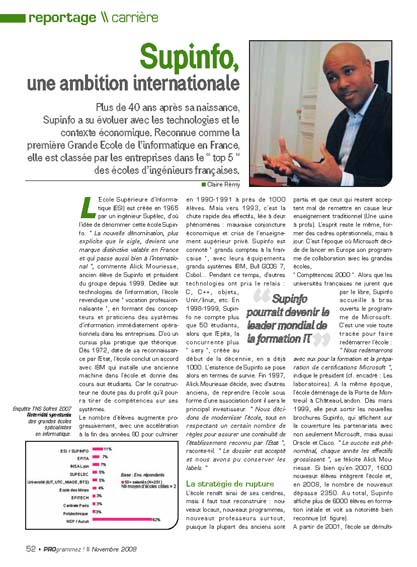 Plus de 40 ans après sa naissance, Supinfo a su évoluer avec les technologies et le contexte économique. Reconnue comme la première Grande Ecole de l’informatique en France, elle est classée par les entreprises dans le " top 5 " des écoles d’ingénieurs françaises.