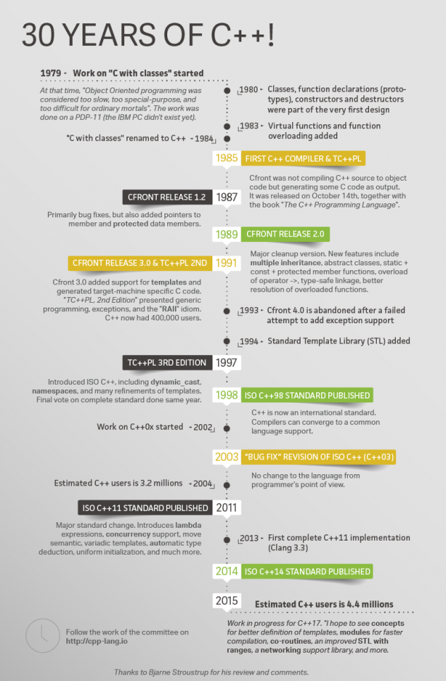 Depuis 1979 et 1985, jusqu'au nouveau standard C++11. C++ a considérablement évolué. Il continuera de le faire, et selon Bjarne Stroustrup, C++17, le nouveau standard en préparation apportera beaucoup de bonnes choses, comme l'introduction des concepts pour faciliter le travail avec les templates, la modularité, une librairie standard STL améliorée, un meilleur support de la programmation concurrente et parallèle, une librairie pour le réseau, entre autres :-)