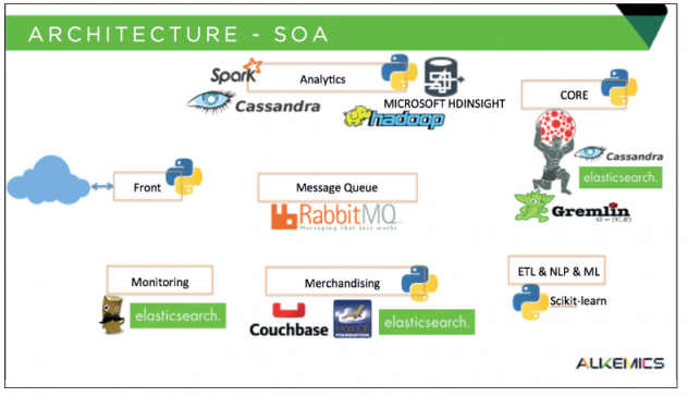 L’infrastructure de production est une architecture orientée services, constituée d'une cinquantaine de composants, communiquant grâce à un broker RabbitMQ et des requêtes HTTP. Cette architecture permet beaucoup de flexibilité en termes de choix technologiques pour l'implémentation du back-end. Alkemics a pu ainsi choisir et faire évoluer chacun des services indépendamment les uns des autres pour répondre au mieux aux besoins de développement. Cette architecture a l’avantage de permettre d’adapter dynamiquement les ressources pour chacun des services sollicités, pour mieux répondre aux besoins réels de traitement. C’est la flexibilité du Cloud.