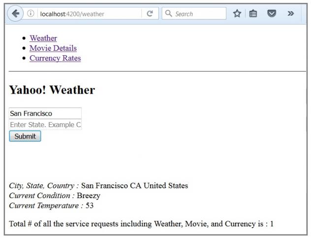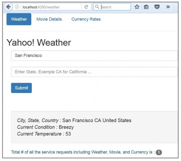 1 2 3 4 5 6 7 8 9 10 11 12 13 14 15 16 17 18 | <h2>Yahoo! Weather </h2> <div class="col-md-8 col-md-offset-2"> <div class="form-group"> <input type="text" [(ngModel)]="id_city" class="form-control" placeholder="Enter City name ..."><br> <input type="text" [(ngModel)]="id_state" class="form-control" placeholder="Enter State. Example CA for California ..."><br> <button type="button" class="btn btn-primary" (click)="callWeatherService()">Submit</button> <br><br><br> <br> <p class="well lead"> <i>City, State, Country :</i> {{ this.op_city }} {{ this.op_region }} {{ this.op_country }} <br> <i>Current Condition :</i> {{ this.op_text }} <br> <i>Current Temperature :</i> {{ this.op_temp }} <br> </p> <p class="text-info">Total # of all the service requests including Weather, Movie, and Currency is : <span class="badge">{{this._sharedService.totReqsMade}}</span> </p> </div> </div> |