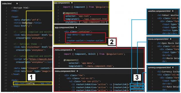 <app-root> à la fin d’index.html est remplacé par le contenu de app.component.html. Celui-ci contient <app-menu> and <router-outlet>. The <app-menu> remplit le contenu de menu.component.html et <router-outlet> est rempli dynamiquement par le contenu de weather.component.html, currency.component.html, ou movie.component.html.
