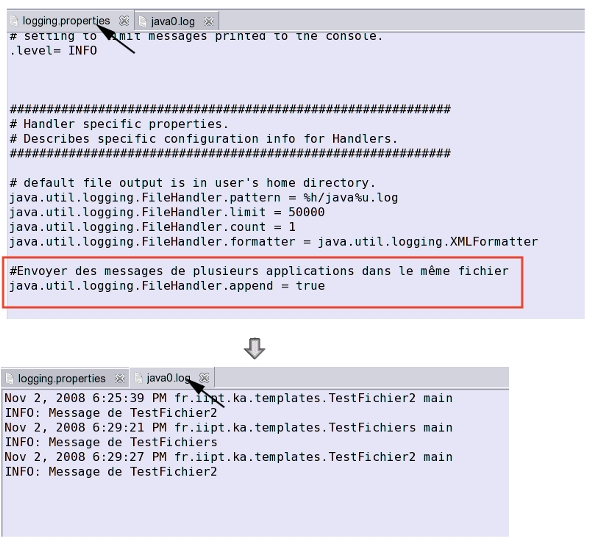 Pour envoyer plusieurs sorties d'applications vers un seul fichier, utiliser " append " dans le fichier log.properties, ou en utilisant le constructeur :
