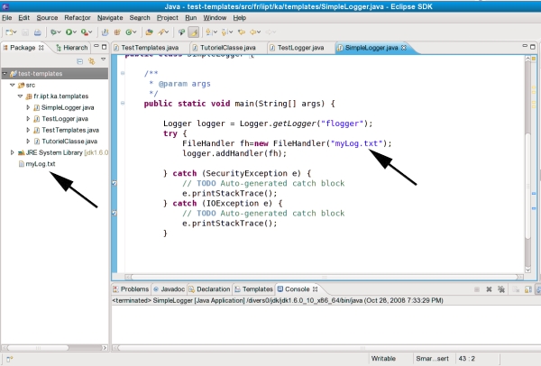 En construisant un objet FileHandler, il est possible de donner un nom au fichier (avec le chemin). Dans Eclipse un fichier sans chemin est un fichier avec un chemin implicite dans le projet en-cours.